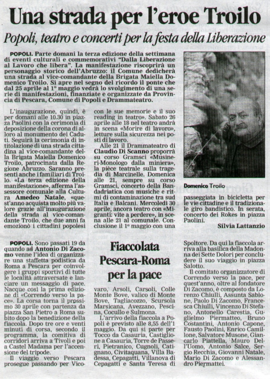 "Una strada per l'eroe Troilo" - Il Centro 24 aprile 2008 sezione Pescara
