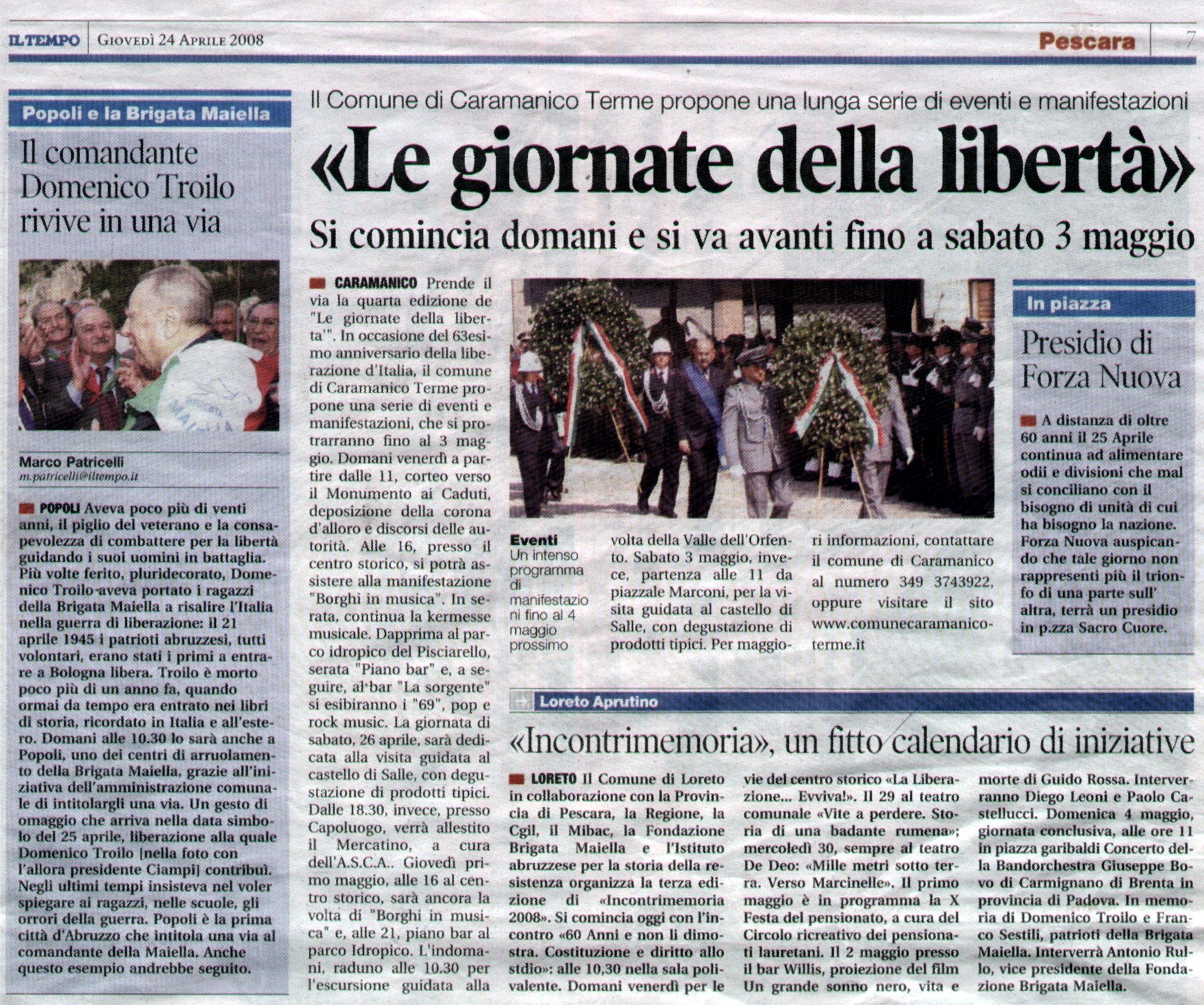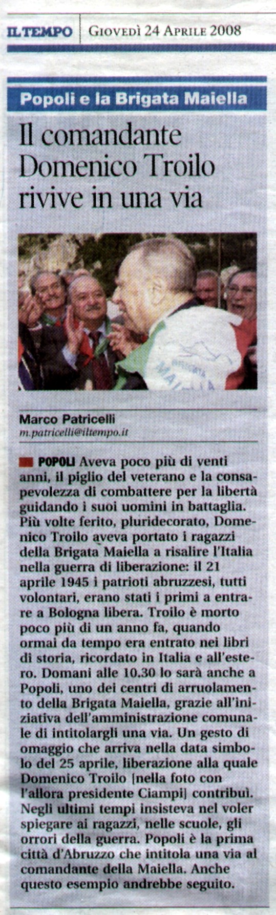 "Il comandante Domenico Troilo rivive in una via" - Il Tempo 24 aprile 2008